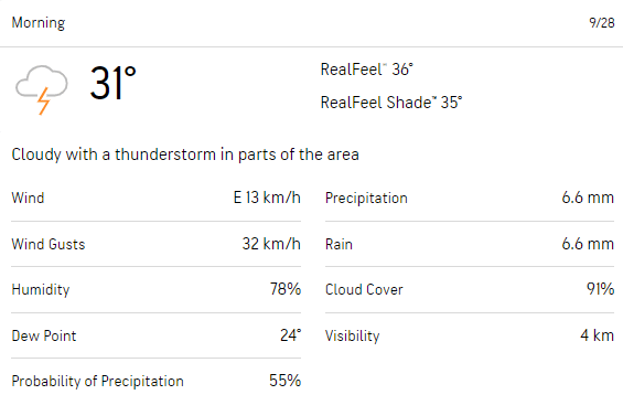 A Cloudy day with thunderstorms in part of the area has been predicted for the day with the precipitation probability of 55%. A cloud cover of 91% is also expected, and bad light could hamper play today.