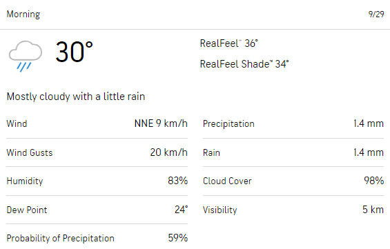 There is a 98% cloud cover and a 59% chance of precipitation. It is expected to be cloudy throughout the morning with a little bit of rain.