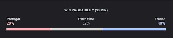 Portugal and France have combined for just four shots thus far in this encounter, giving little opportunity to either team. Deschamps' team has produced 0.08 expected goals, compared to merely 0.02 for Martinez's side.