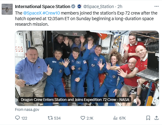 The SpaceX Crew10 members joined the station's Exp 72 crew after the hatch opened at 12:35am ET on Sunday beginning a long-duration space research mission.