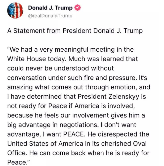 “I have determined that President Zelenskyy is not ready for peace if America is involved, because he feels our involvement gives him a big advantage in negotiations. I don’t want advantage; I want PEACE," President Trump wrote on his Truth Social account.
