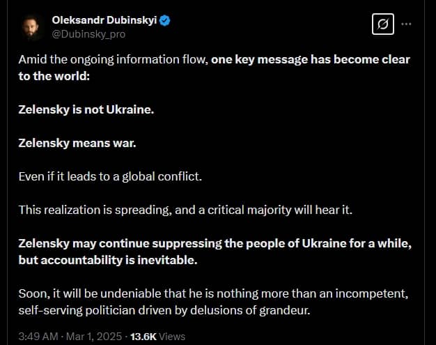“It is very important for us that Ukraine is heard and that no one forgets about it, neither during the war nor after. It is important for people in Ukraine to know that they are not alone, that their interests are represented in every country, in every corner of the world," Zelenskyy after booted out of Oval House.