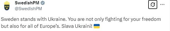 "Sweden stands with Ukraine. You are not only fighting for your freedom but also for all of Europe’s. Slava Ukraini!" his post read.