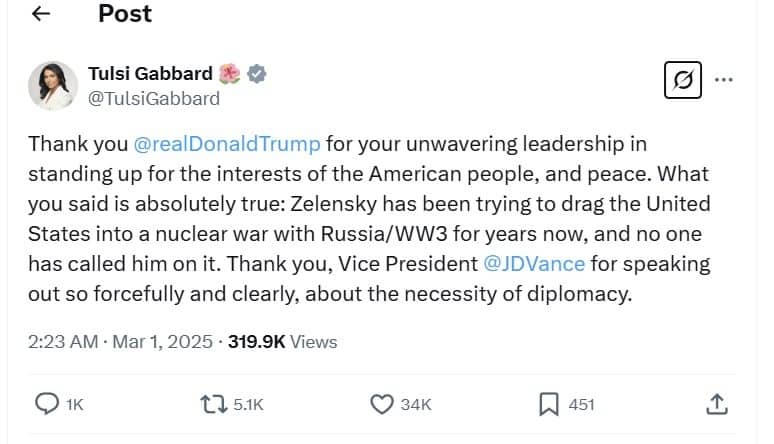 Tulsi Gabbard, the new US Director of National Intelligence, thanked President Donald Trump for his “unwavering leadership” after his public confrontation with Ukrainian President Volodymyr Zelenskyy in the Oval Office on Friday.