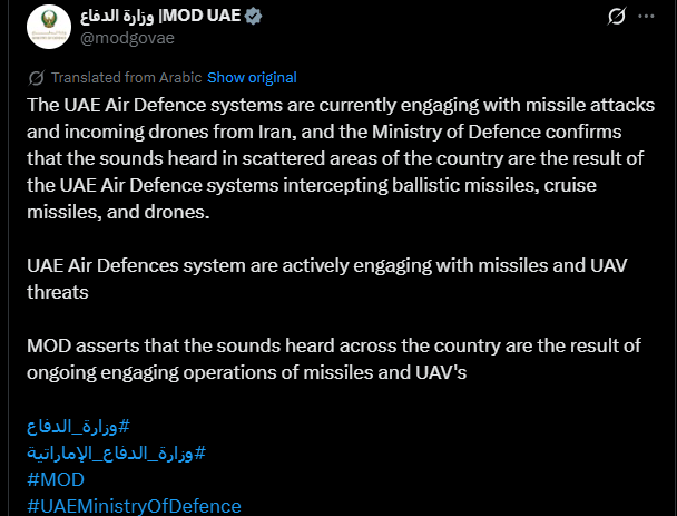 UAE Says Air Defences 'Actively Engaging' With Missiles; Urges Public to Remain Calm