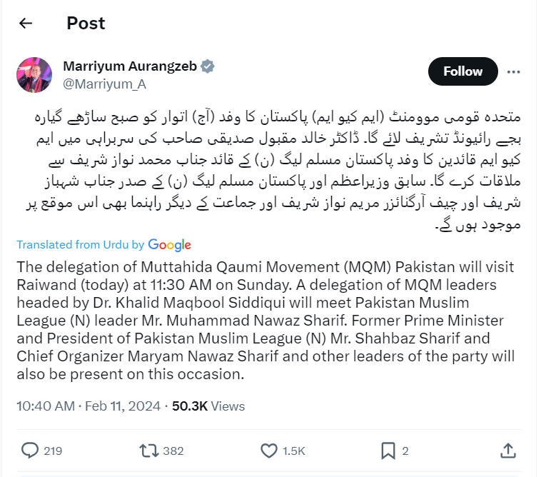 PML-N's Information Secretary Marriyum Aurangzeb said that the MQM-P delegation, led by convener Dr Khalid Maqbool Siddiqui, will visit the Sharifs at their Raiwind residence at 11:30 am. “The delegation of Muttahida Qaumi Movement (MQM) Pakistan will visit Raiwand (today) at 11:30 AM on Sunday. A delegation of MQM leaders headed by Dr. Khalid Maqbool Siddiqui will meet Pakistan Muslim League (N) leader Mr Muhammad Nawaz Sharif. Former Prime Minister and President of Pakistan Muslim League (N) Mr Shahbaz Sharif and Chief Organizer Maryam Nawaz Sharif and other leaders of the party will also be present on this occasion,” Aurangazeb wrote on X, formally known as Twitter.