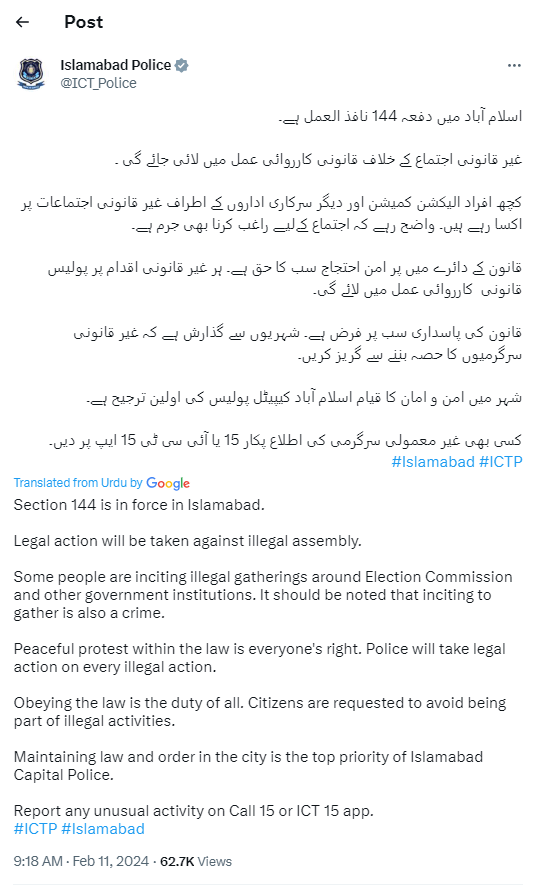 Hours after PTI announced a nationwide protest over electoral malpractices, the Islamabad police imposed Section 144 in the country's national capital. “Section 144 is in force in Islamabad. Legal action will be taken against illegal assembly. Some people are inciting illegal gatherings around the Election Commission and other government institutions. It should be noted that inciting to gather is also a crime,” the Islamabad police wrote on X, formally known as Twitter. “Peaceful protest within the law is everyone's right. Police will take legal action on every illegal action. Obeying the law is the duty of all. Citizens are requested to avoid being part of illegal activities. Maintaining law and order in the city is the top priority of Islamabad Capital Police. Report any unusual activity on Call 15 or ICT 15 app. #ICTP #Islamabad," the police furthered.