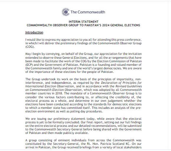 Commonwealth issues interim statement on Pakistan 2024 polls