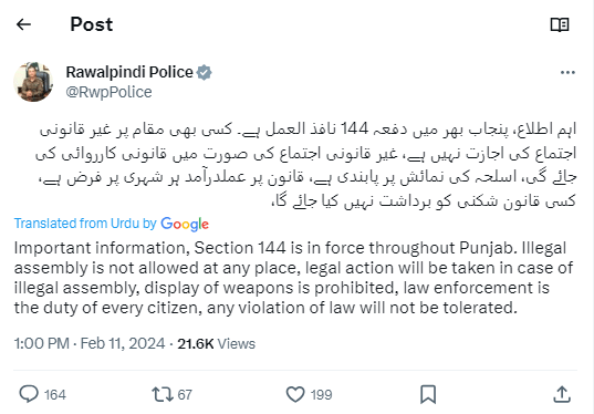 Ahed of PTI's nationwide protest, the Rawalpindi police have imposed Section 144 in the region and warned of “legal actions” against illegal assembly. “Important information, Section 144 is in force throughout Punjab. Illegal assembly is not allowed at any place, legal action will be taken in case of illegal assembly, display of weapons is prohibited, law enforcement is the duty of every citizen, and any violation of the law will not be tolerated,” the police wrote on X, formally known as Twitter.