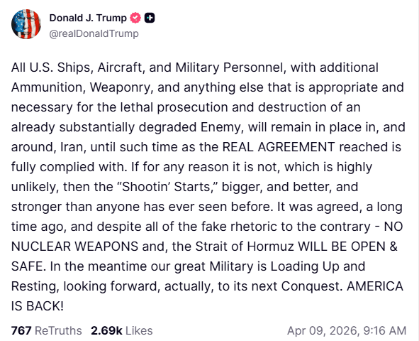 US-Iran Ceasefire Day 2: Trump announced on Truth Social that the US will deploy military resources against a degraded enemy, warning of severe consequences if agreements aren't followed, emphasizing no nuclear weapons and ensuring the Strait of Hormuz remains open and safe.