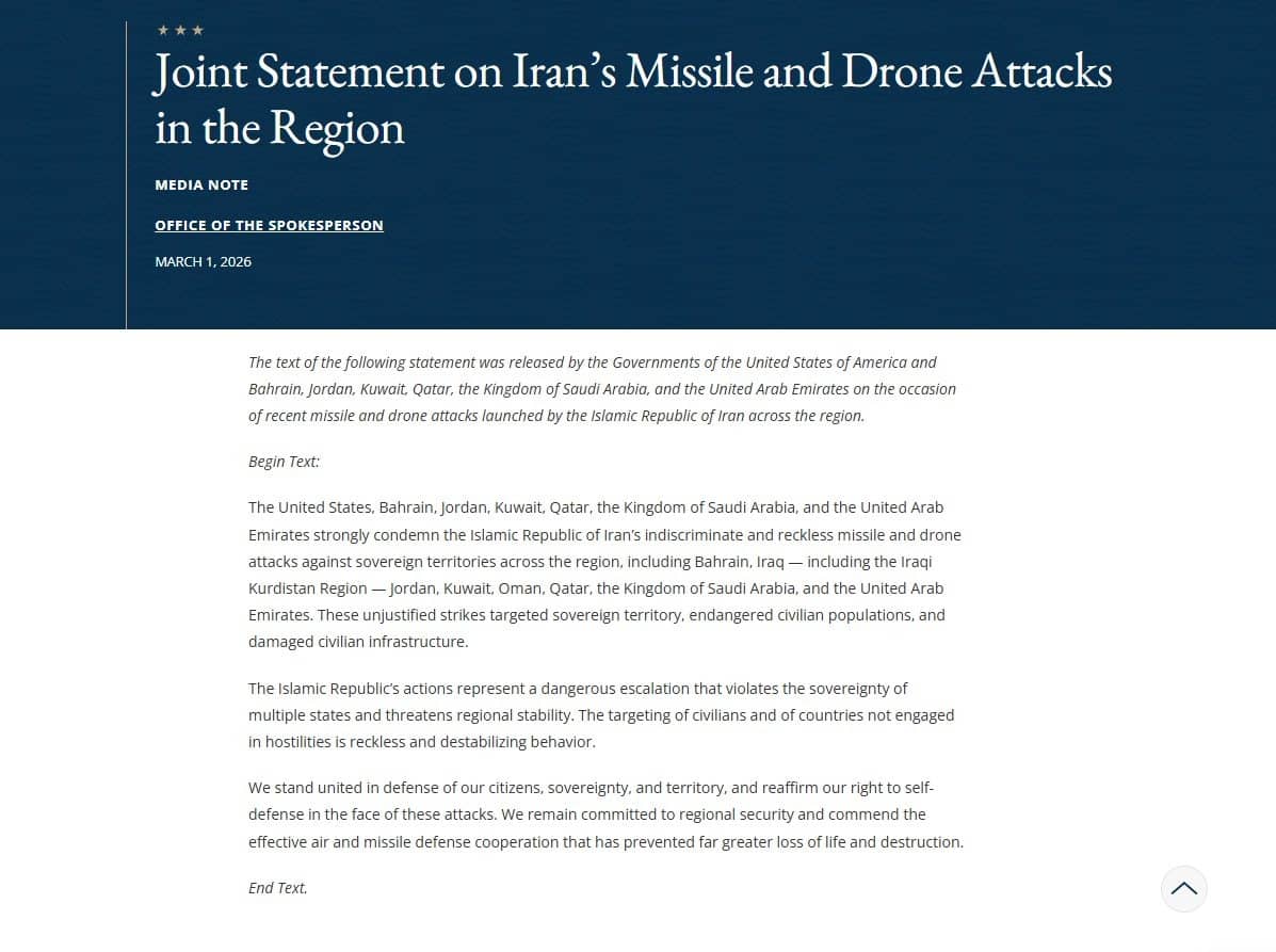 US, Bahrain, Jordan, Kuwait, Qatar, Saudi Arabia, UAE Issue Joint Statement