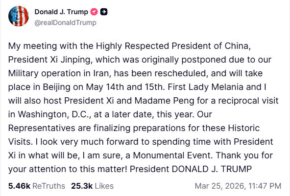 Trump to Visit China on May 14-15 After Iran War Delay