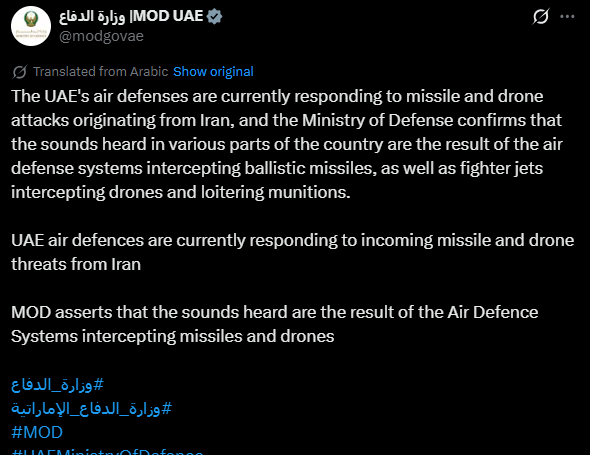 West Asia War LIVE Updates: The Emirati Ministry of Defence reports responding to missile and drone threats from Iran, stating the sounds heard are from Air Defence Systems intercepting these threats.'
