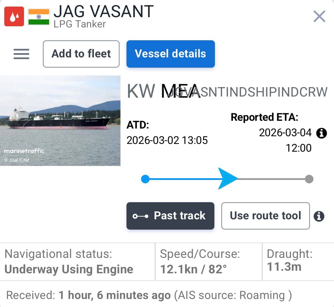 Indian Flagged LPG Carrier 'Jag Vasant' Expected To Dock At Kandla Port Today