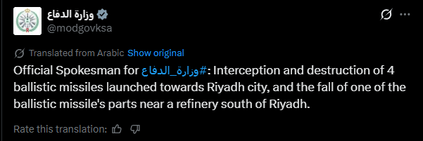 Saudi Arabia Says It Intercepted 4 Ballistic Missiles Fired Toward the Capital