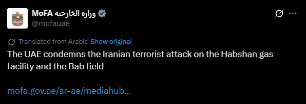 UAE Condemns Iranian Attacks on Habshan Gas Facility And Bab Field
