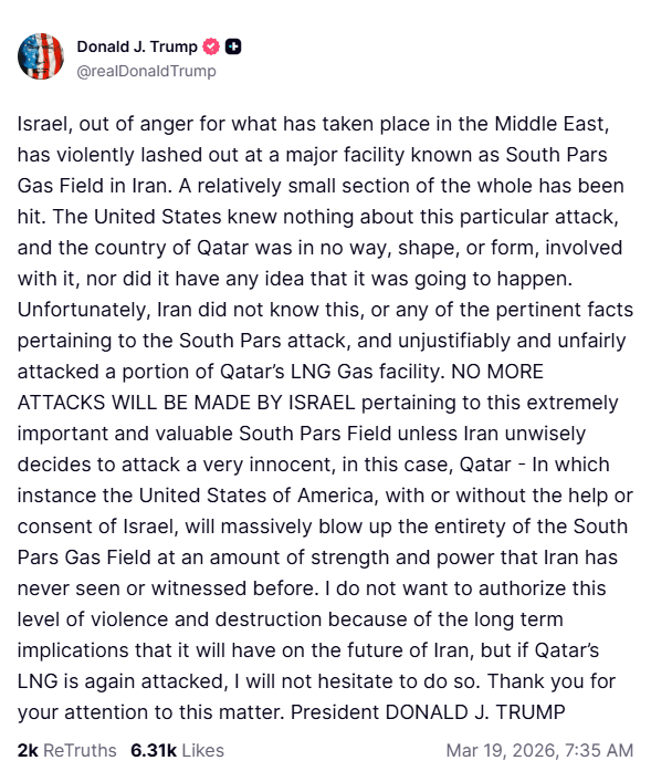 Trump Vows 'Destruction' If Iran Attack Qatar's LNG Again; Claims Israel Won't Strike Again