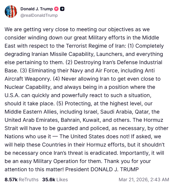 West Asia War LIVE Updates: The US President said the United States is “getting very close to meeting objectives as it considers winding down its military efforts in the Middle East".