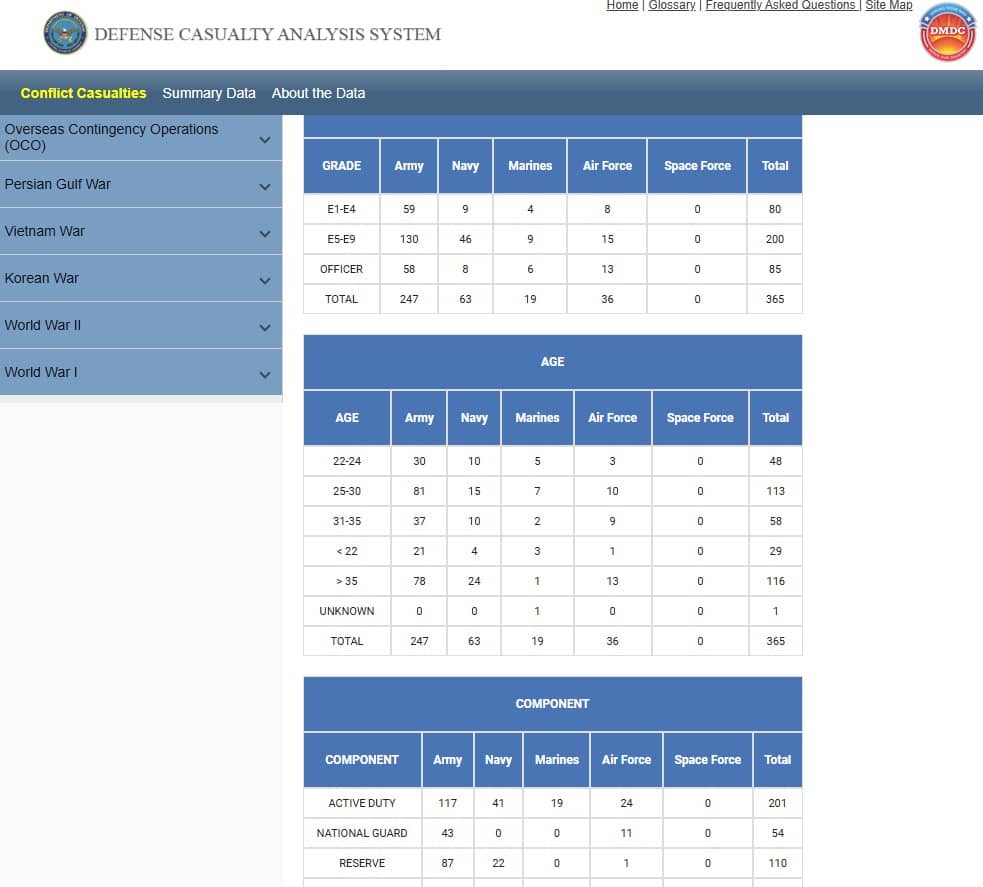 Most, 247, are Army soldiers; 63 are in the Navy; 19 are in the Marines; and 36 are in the Air Force. The death toll remains at 13, according to the data.