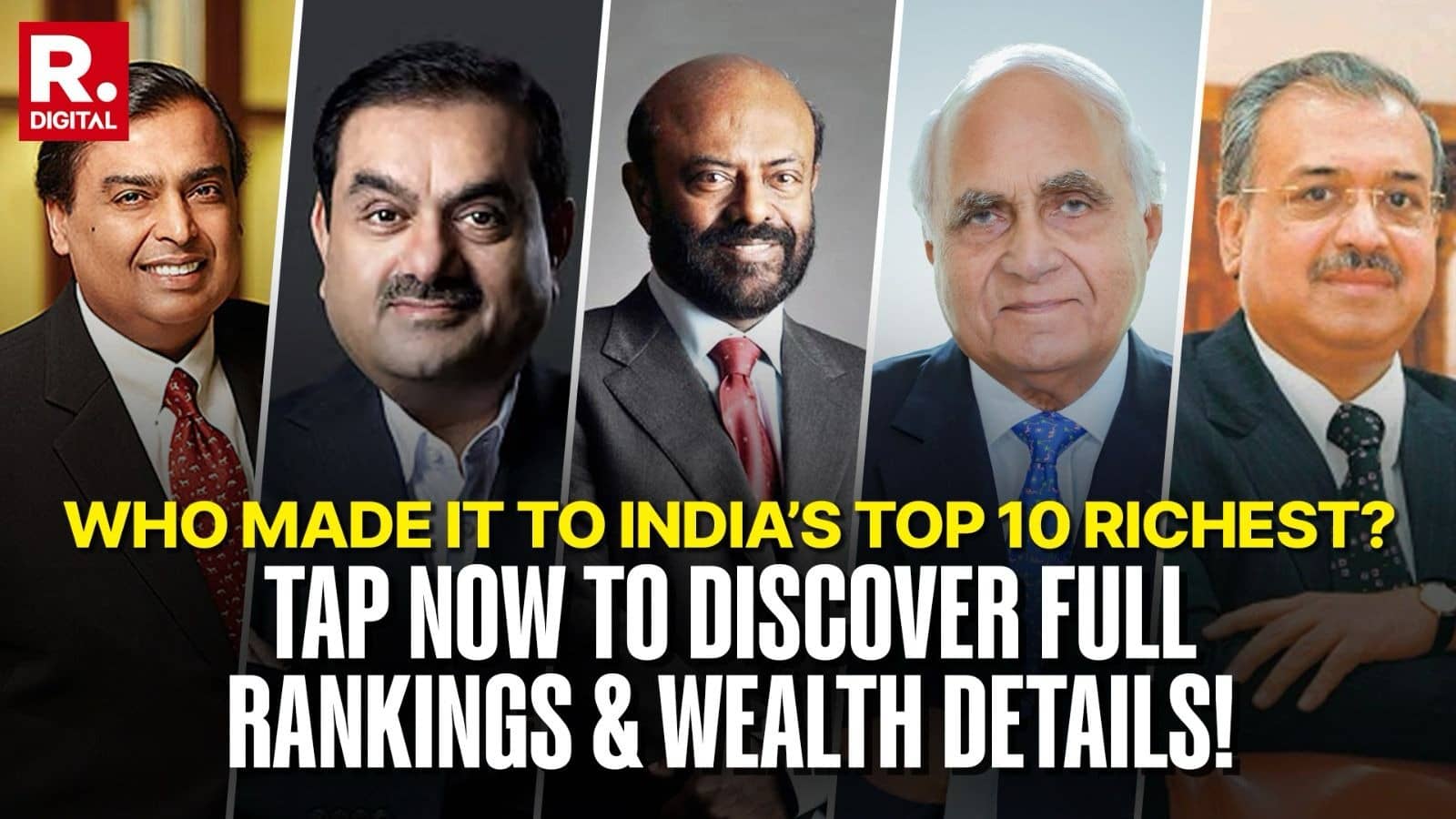 Mukesh Ambani, chairman of Reliance Industries, continues to dominate the list, while Gautam Adani retains the second position despite ongoing market volatility.