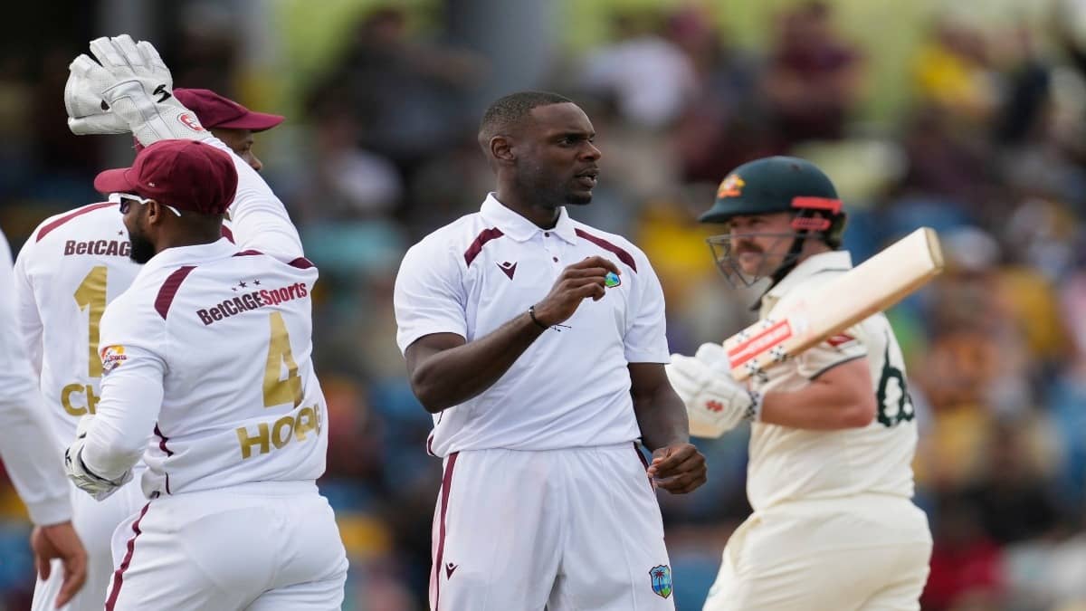 WI vs AUS: West Indies bowler showcased a fine bowling display to restrict Australia to 180 runs. Shamar Joseph and Jayden Seales ran through the Aussie batting lineup as Pat Cummins' side didn't even get past the 200-run barrier in the first Test at Kensington Oval, Barbados.