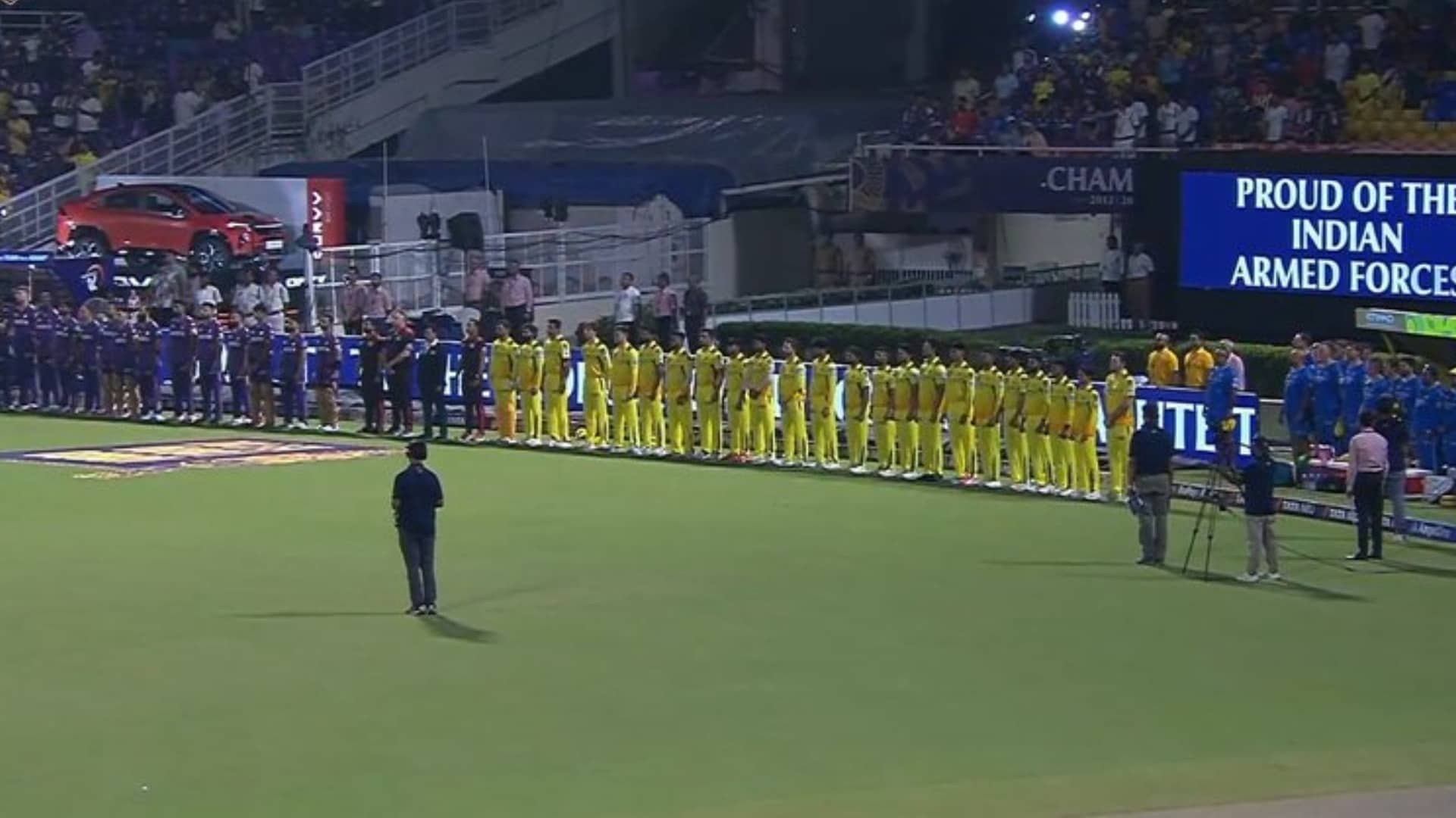 Before the KKR vs CSK match began, players of both teams lined up with the match officials on the outfield. The Indian national anthem was played as all the players, match officials, and the coaching staff stood up to honour the Indian Armed Forces' efforts.