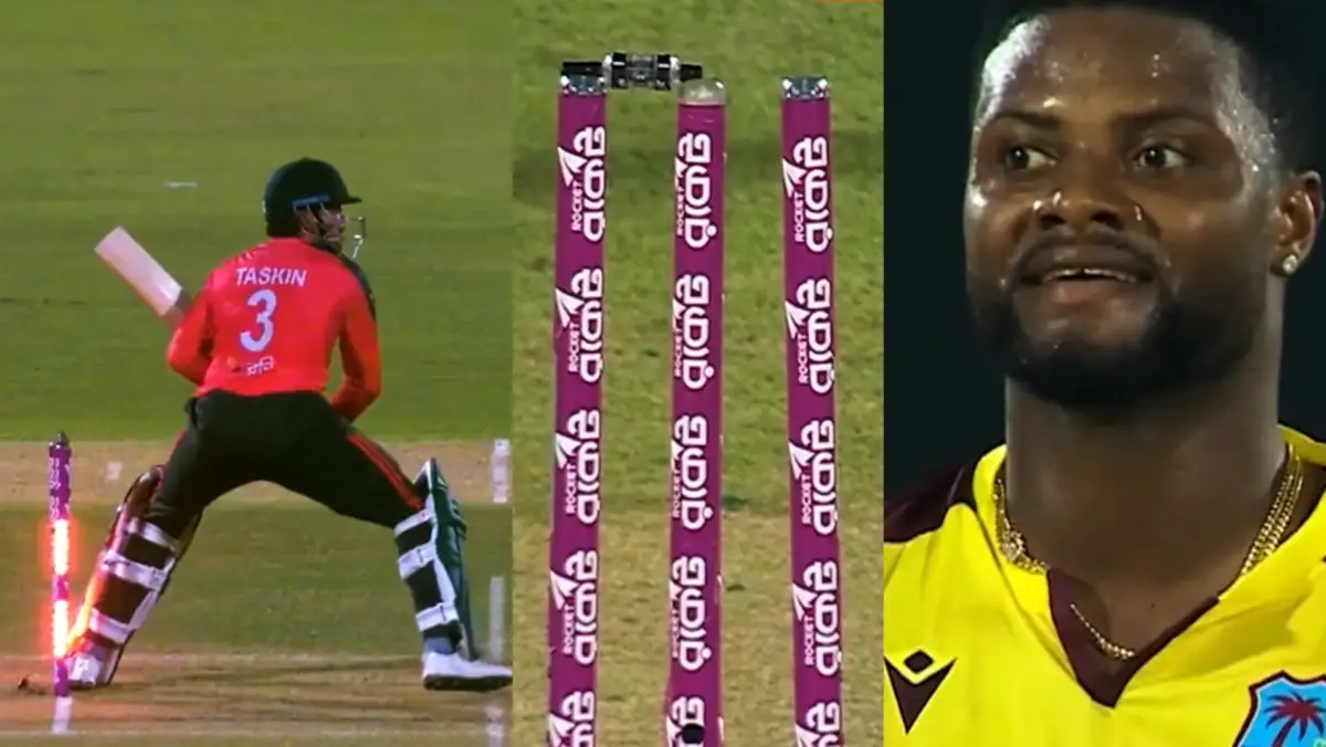 Bangladesh, while chasing the total, crumbled under pressure, and they needed 17 runs off the last ball to win the match. Taskin Ahmed, who was on strike, tried to hit a six on Romario Shepherd's last delivery. Ahmed went deep inside his crease and hit a huge six off a full delivery from Shepherd, but in the process, he forgot where the stumps were and ended up dismissing himself.