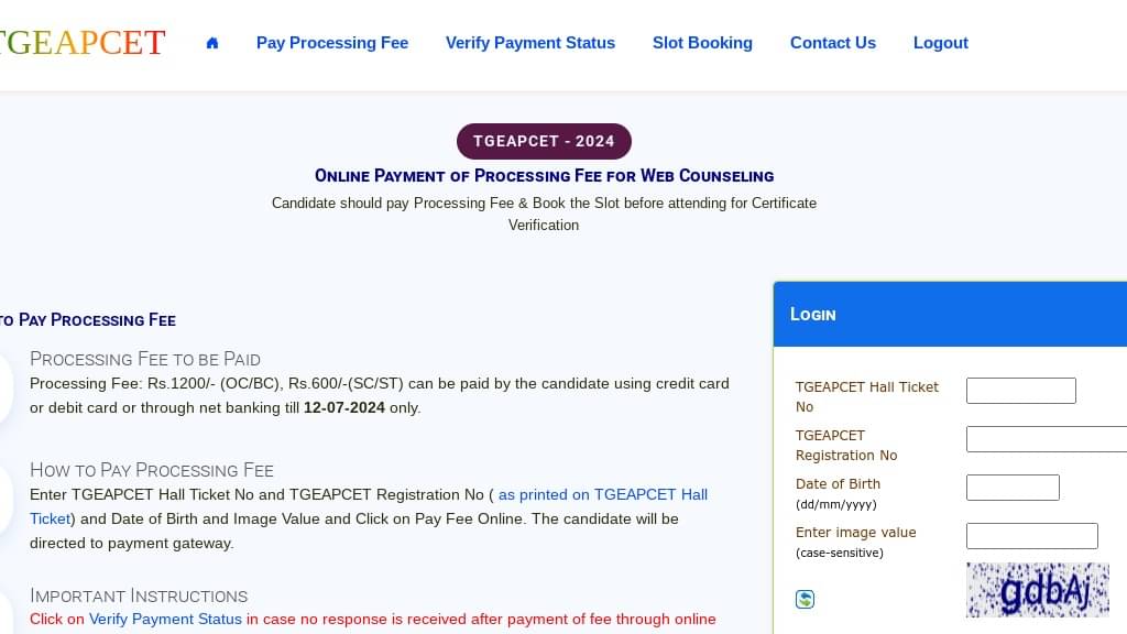 Processing Fee: Rs.1200/- (OC/BC), Rs.600/-(SC/ST) can be paid by the candidate using credit card or debit card or through net banking till 12-07-2024 only.
