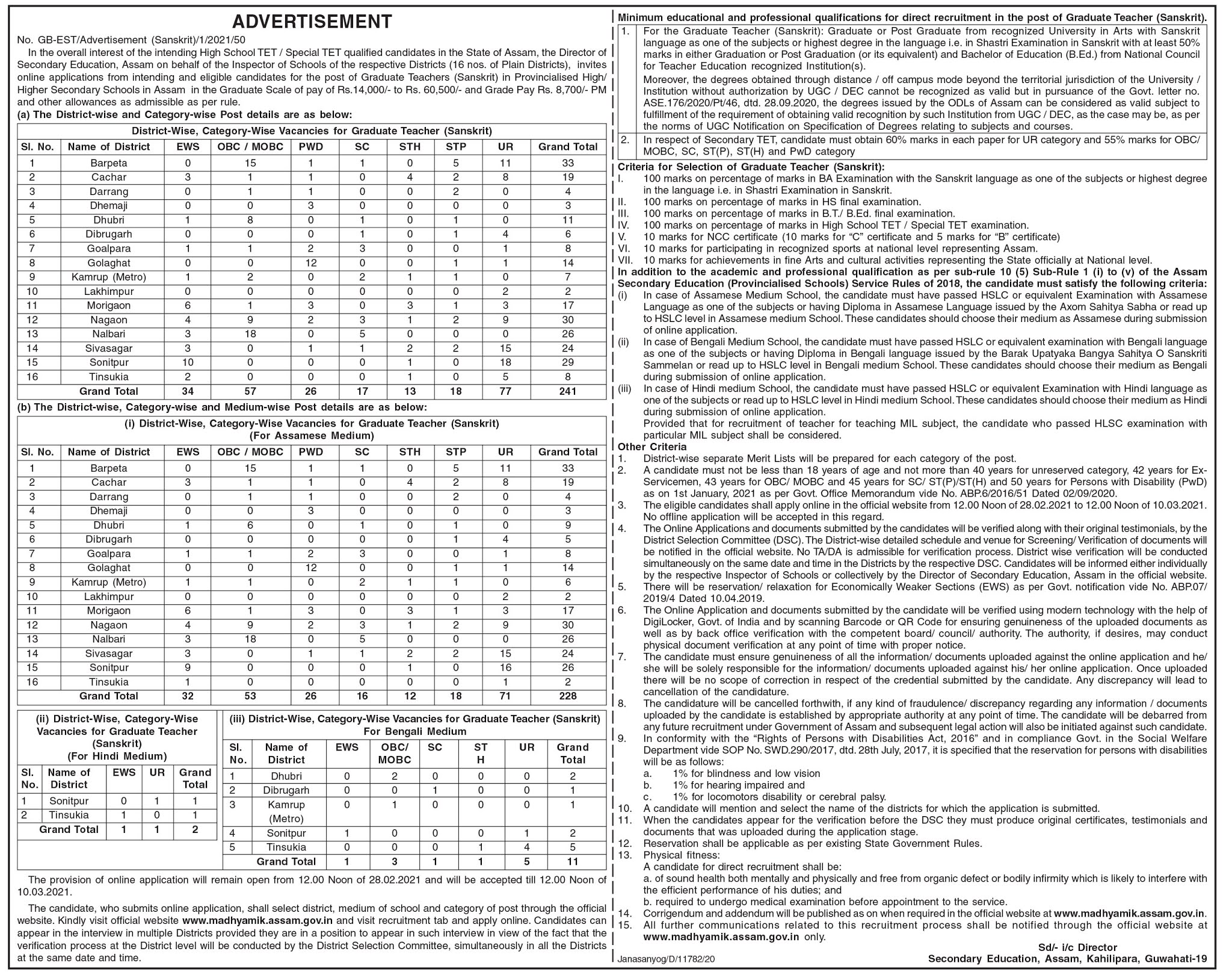 DSE Assam Recruitment: DSE invites applications for 241 Graduate Teacher posts