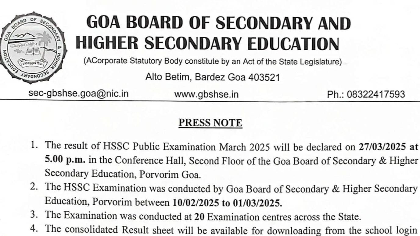 Goa HSSC Result 2025: The Goa Board of Secondary and Higher Secondary Education (GBSHSE) will announce the Goa Higher Secondary School Certificate (HSSC) Result 2025 on 27th March 2025 at 5 PM. The results will be declared at the board office conference hall in Porvorim. Once released, students and parents can check them on the official websites gbshse.in and results.gbshsegoa.net.