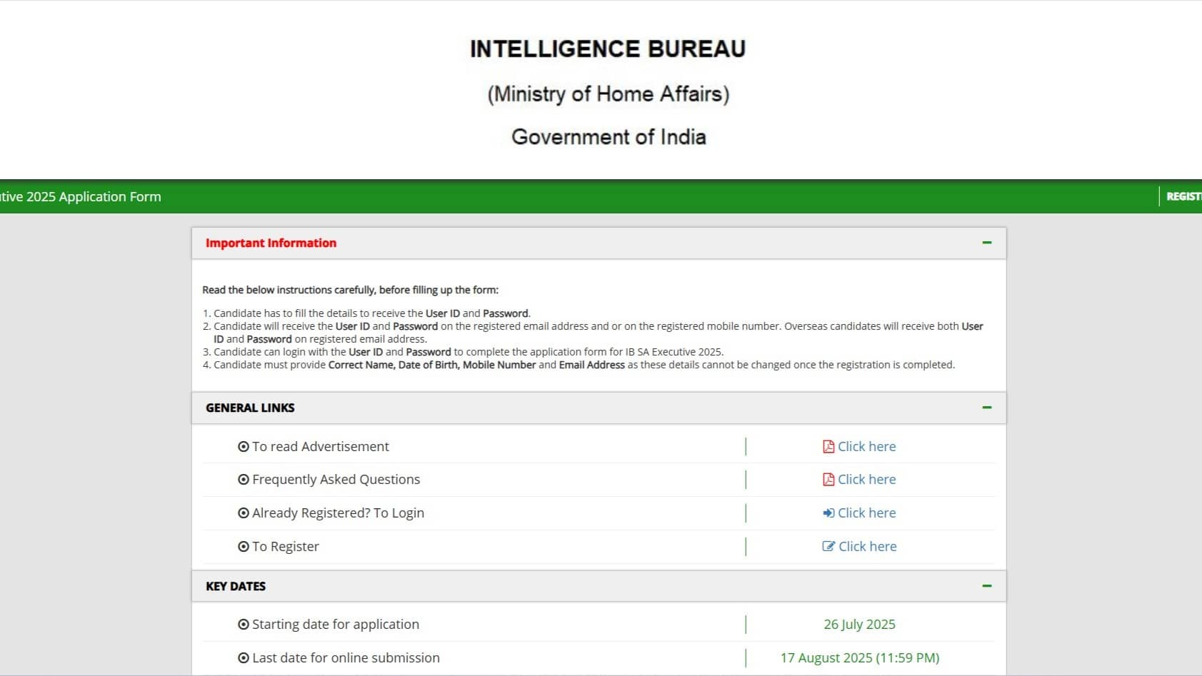 The Intelligence Bureau (IB) has launched the online application process for Security Assistant/Executive positions starting today, July 26, 2025. Here is all you need to know.