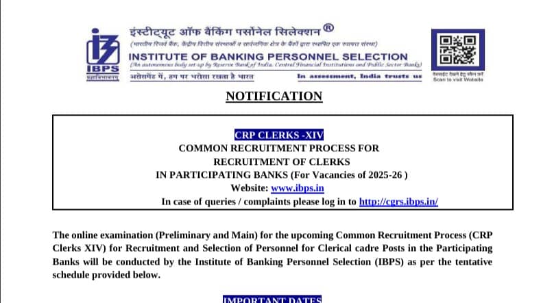 IBPS Clerk Notification 2025: The Institute of Banking Personnel Selection (IBPS) has released the recruitment notification of CRP Clerks XIV for 6128 vacancies