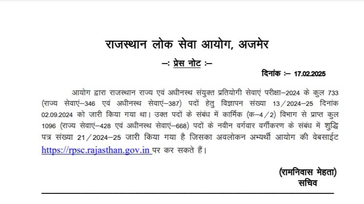 According to the latest notification, RPSC will now fill 1,096 vacancies through RPSC RAS 2024, up from the previously announced 733. The prelims examination for RPSC RAS 2024 took place on February 2, 2025.