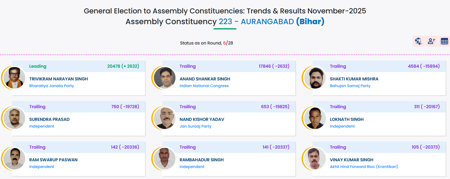AURANGABAD (Bihar) Assembly Election Results Live: Republicworld.com brings to you the fastest results from the Bihar Assembly Election 2025. Get Aurangabad district constituency results, trends and expert analysis of the high-stakes battle between the BJP-JDU-led NDA and the RJD-Congress-led Mahagathbandhan.