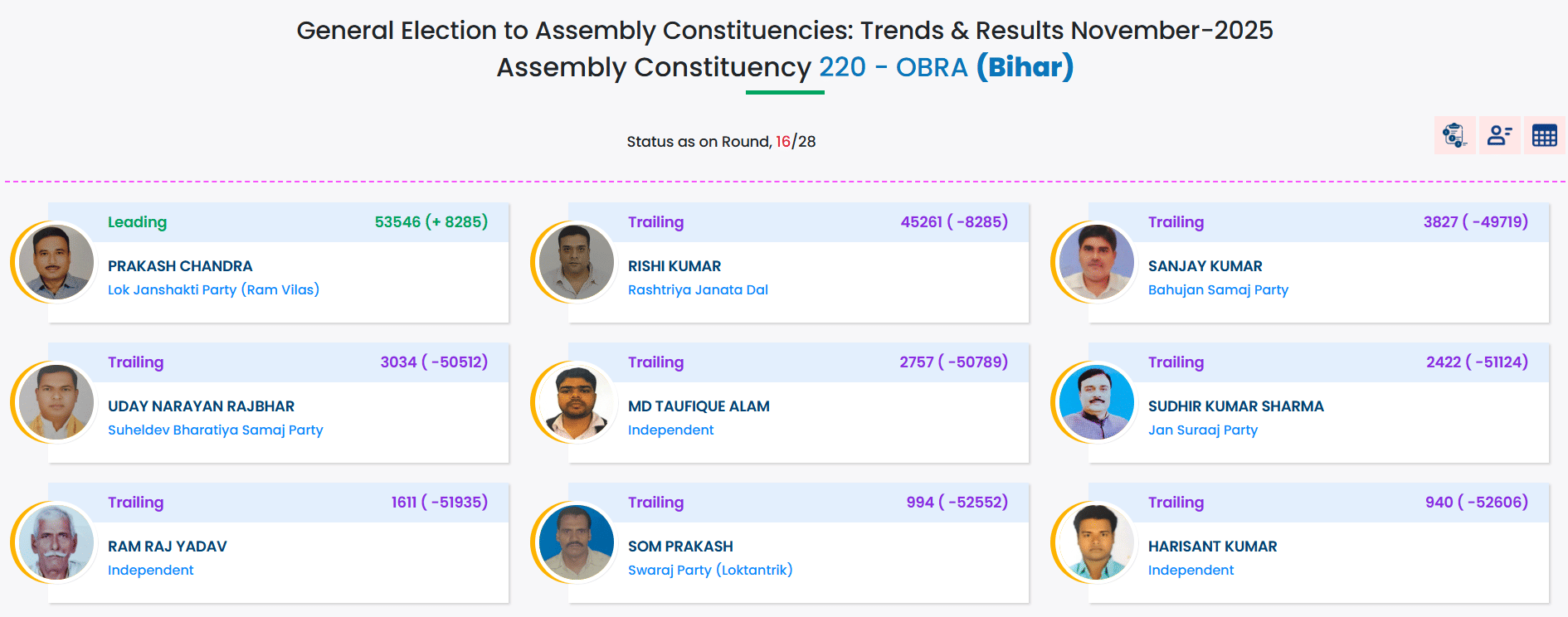 AURANGABAD (Bihar) Assembly Election Results Live: LJPRV candidate Prakash Chandra is currently in the lead in Obra with 64018 votes. RJD candidate Rishi Kumar is in the second position with 52145 votes.