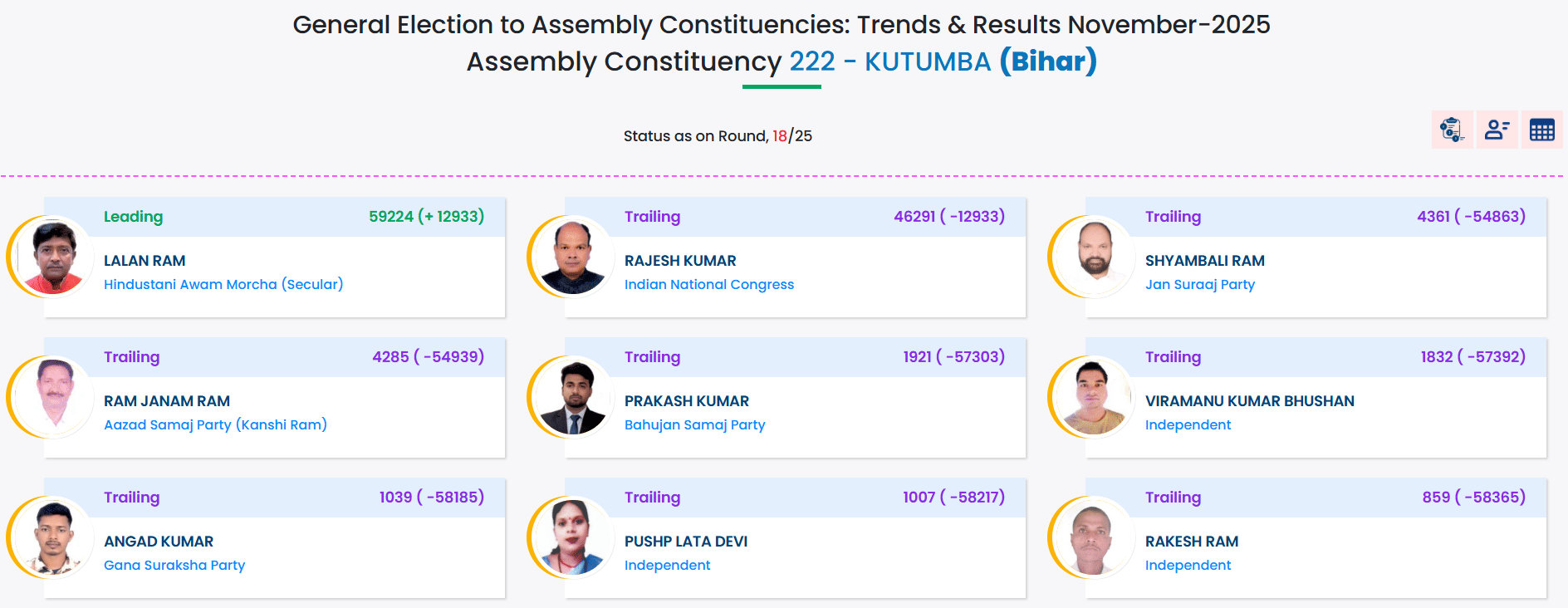 AURANGABAD (Bihar) Assembly Election Results Live: Counting is still on in Kutumba (SC), but things look pretty good for HAM(S) candidate Lalan Ram right now. Lalan Ram has a comfortable lead of 10651 votes over INC candidate Rajesh Kumar right now.