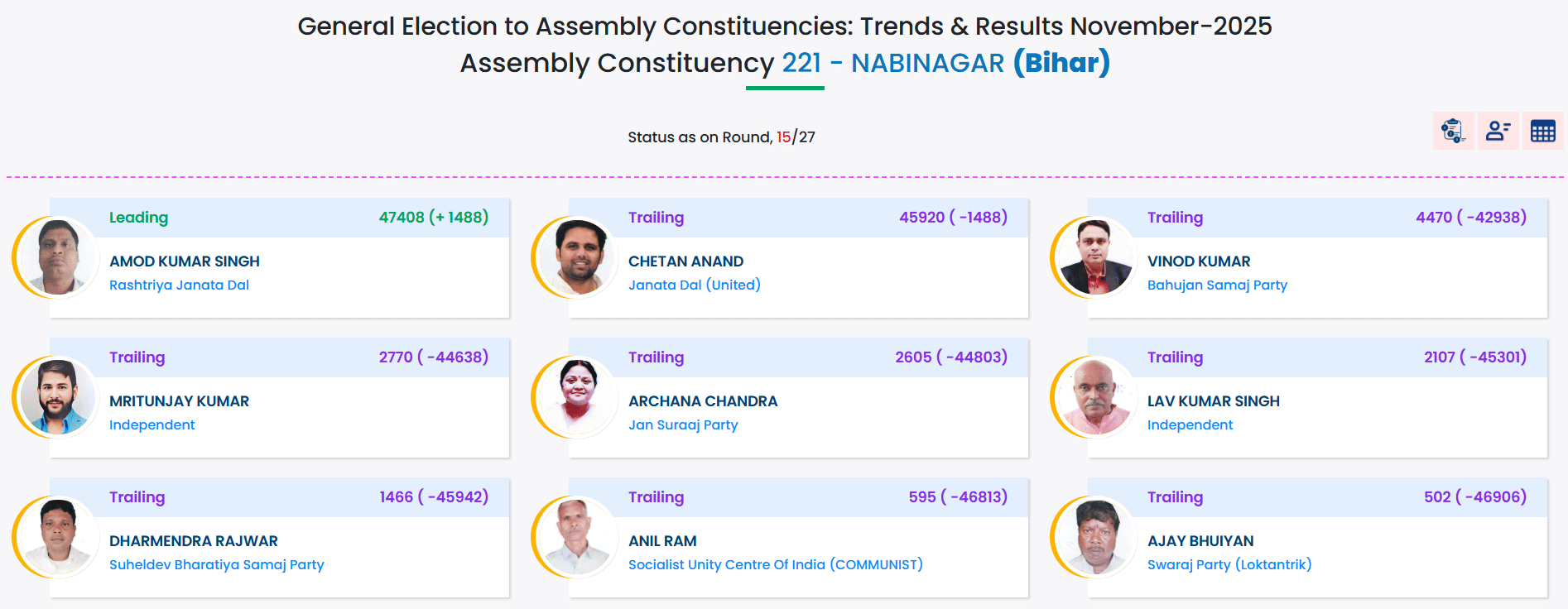 AURANGABAD (Bihar) Assembly Election Results Live: AMOD KUMAR SINGH from Rashtriya Janata Dal (RJD) is leading with 15,491 votes, holding a margin of 703 over CHETAN ANAND from Janata Dal (United) at 14,788 votes in Nabinagar.