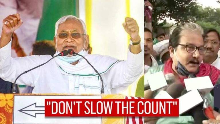 As NDA maintains its single-digit lead over Mahagathbandhan, RJD MP Manoj Jha on Tuesday, made a bizarre request to CM Nitish Kumar to not slow the vote-count