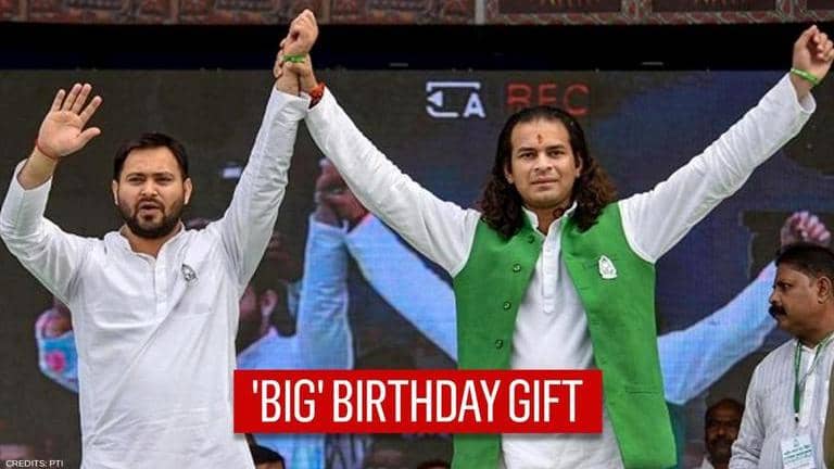 Buoyed by favourable exit polls indicating a Mahagathbandhan victory in Bihar state election, RJD leader and Tejashwi's elder brother - Tej Pratap said that 'people have already gifted the CM chair to Tejashwi on his birthday', on Monday. Tejashwi - who turns 32 - celebrated a quiet birthday, a day ahead of the Bihar poll results. Bihar polls were held in three phases on October 28, November 3 and November 7. Results will be announced on November 10.