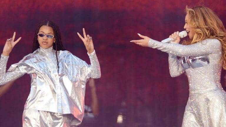 Beyonce, daughter Blue Ivy twin in sparkling silver outfits at Renaissance concert