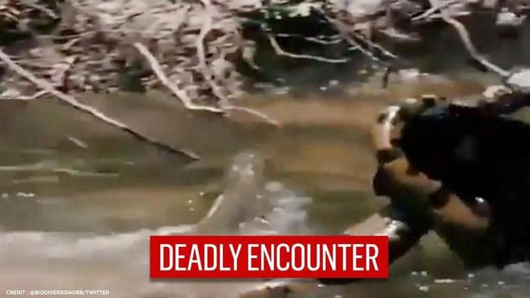 In a gripping moment, a black panther drags a venomous anaconda out of the water as a fierce battle between the two predators ensues. Shared out of the official Twitter handle of Brazil's Biodiversity centre named 'Biodiversidade Brasileira', the nearly 10-second-long video left the internet stunned as the gigantic black panther, takes on the majestic American green anaconda in South American forest. The old video has resurfaced online and has thrilled the wildlife buffs as the world's biggest snake is seen struggling for survival as it retaliates to the deadly blows of the wild cat inside the river. The clip amassed more than 77,000 views and a slew of reactions.