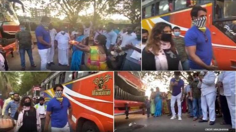 The Bollywood actor has now arranged buses for 200 Idli vendors from Mumbai to send them home — Tamil Nadu. The actor was honored with aarti and even cracked coconut for good luck in front of the bus.