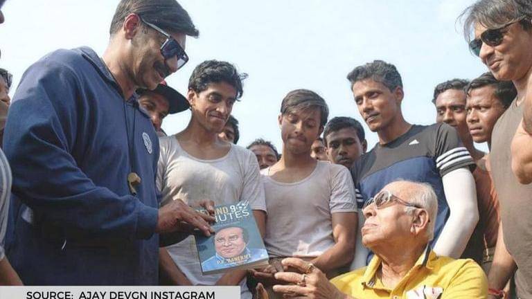 Ajay Devgn shared a picture of him holding a book of PK Banerjee himself titled 'Beyond 90 minutes' showcasing the book to the legend as he is seen sitting on a chair. This adorable picture was taken during the shooting of Ajay Devgn’s film Maidaan. Apart from them, there is a large crowd surrounding them in the picture.