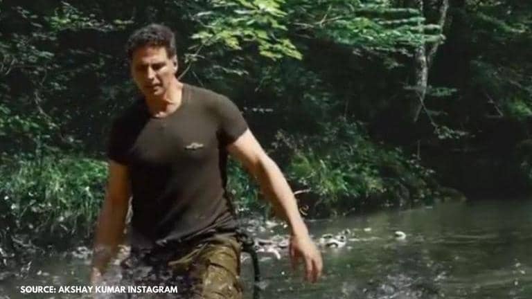 The actor was seen in a casual black t-shirt and cargo pants. Akshay Kumar and Bear Grylls set out on a mad adventure and were seen enjoying their time into the wild. In one of the scenes, Bear Grylls surprises Akshay Kumar with elephant poop tea and challenges him to drink it. In another scene, the Khiladi actor is seen river rappelling, while crocodiles were spotted in the water.