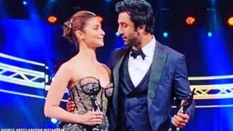 In this picture shared by Neetu Kapoor, Alia Bhatt is seen posing with beau Ranbir Kapoor, with their respective Filmfare Awards. While Alia can be seen in a sequined bead-studded marron attire, Ranbir Kapoor stuns in a humble tuxedo. Take a look: