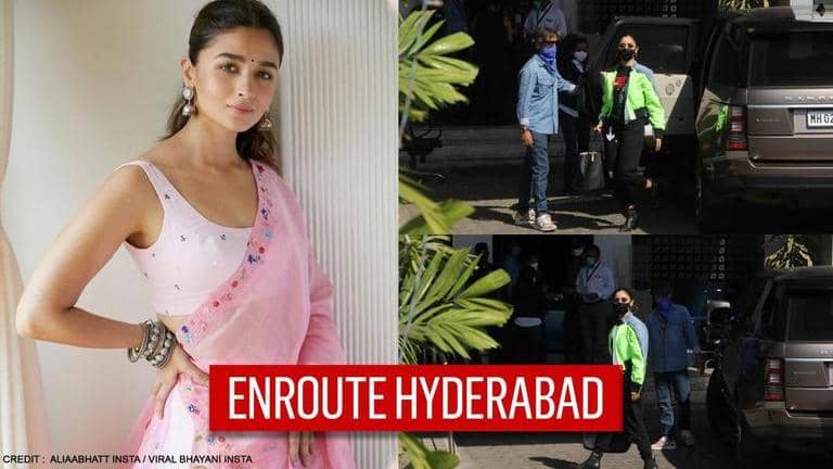 Alia Bhatt on Sunday left for Hyderabad to shoot director SS Rajamouli's "Rise Roar Revolt" (RRR). The actor was spotted at the Kalina airport in black outfit paired with a neon green jacket.