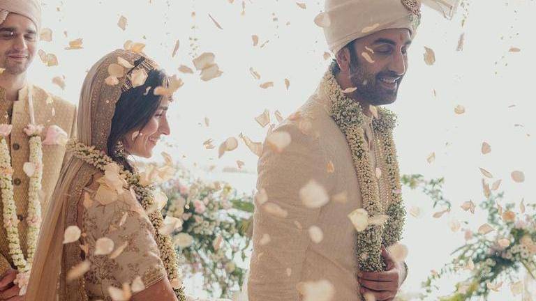 Soni took to social media and shared a series of photos. The first photo gives a closer glimpse of Alia and Ranbir holding each other's hands. In the second photo, they were seen sitting in the wedding mandap with folded hands. In the third photo, the couple can be seen all smiles as they take pheras. While Alia wore an intricately embroidered ivory saree, Ranbir opted for a colour-coordinated sherwani.