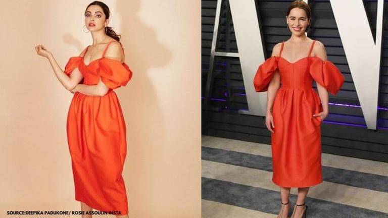 Deepika Padukone's red strappy dress with long puffy sleeves reminded people of the same outfit worn by Emilia Clarke. Take a look to decide who wore it better.