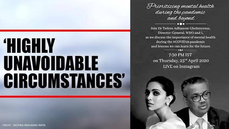 With an aim to prioritize mental health during the coronavirus pandemic, Bollywood star Deepika Padukone and WHO Director-General Tedros Adhanom Ghebreyesus had announced an online discussion on Sunday. Due to 'highly unavoidable circumstances', the actor on Wednesday announced that the chat has been 'put on hold until further notice'.