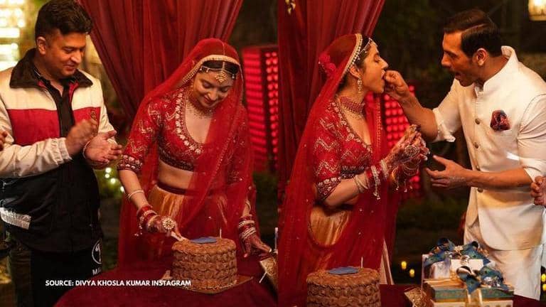 In the picture shared by the actor, she can be seen dressed as her character Sita Rameshwar. Donning a bridal look, it appears that the birthday cake was cut by her soon after wrapping up the shooting schedule. Co-actor John Abraham can be seen smiling in the backdrop, he appears to be dressed as a groom.
